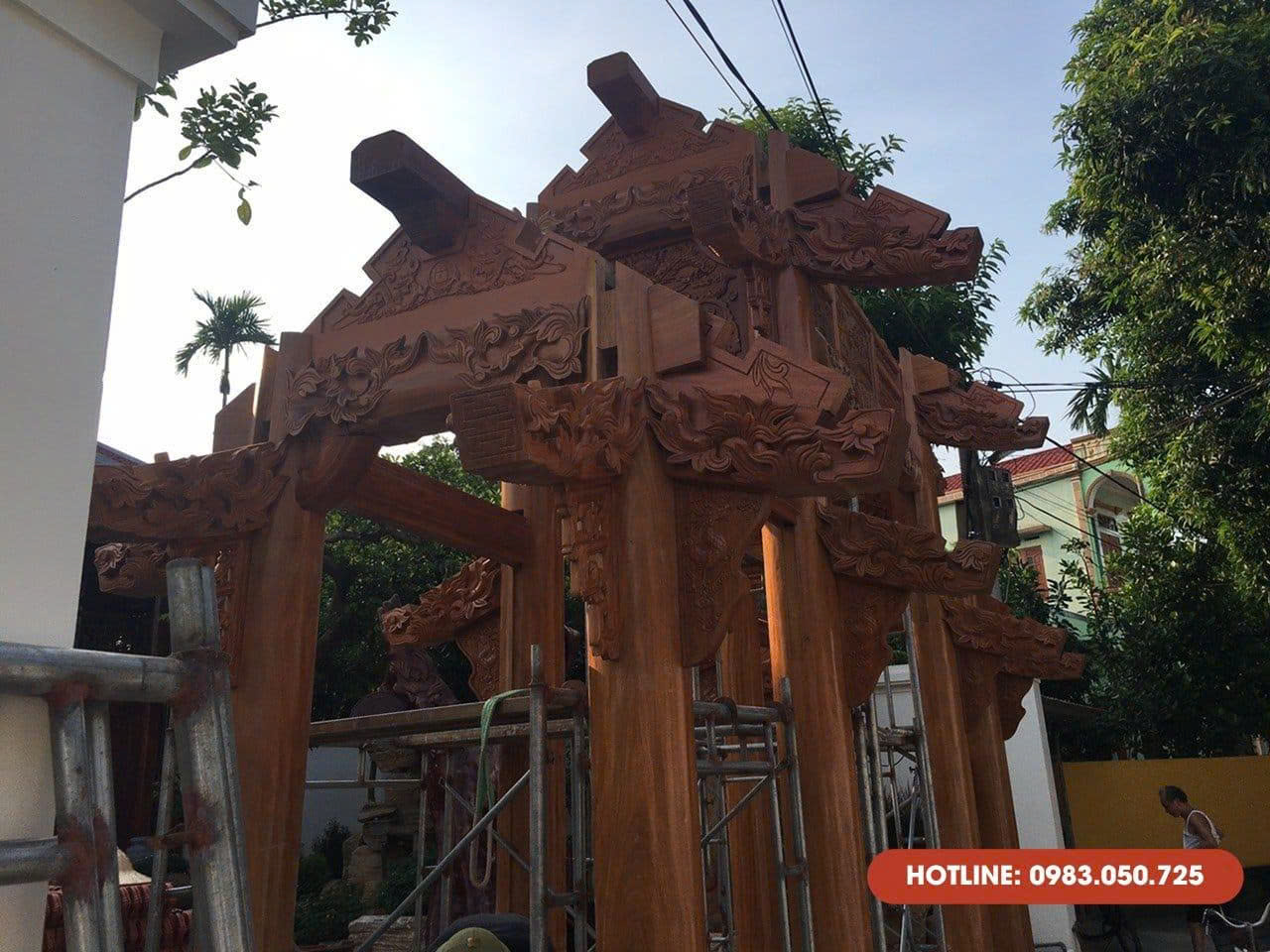 Tại Nhà gỗ Quang Vinh, mỗi chiếc cổng gỗ là kết quả của quá trình làm nghề đầy tâm huyết. Người thợ không chỉ cắt gọt và ghép nối gỗ, mà còn thổi hồn vào từng đường nét chạm khắc. Các họa tiết quen thuộc như rồng, phượng, hoa sen, hay chữ Phúc – Lộc – Thọ đều được đục nổi, tạo nên vẻ đẹp trang nghiêm và phú quý. Từng chi tiết nhỏ đều thể hiện sự chỉn chu, cầu toàn – đúng chất của người làm mộc truyền thống.