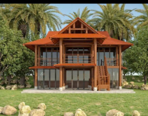 Công trình có hiên rộng, bếp lửa giữa nhà, phần sàn cao và thoáng, tạo nên một không gian gắn kết mang tính tập thể. Vật liệu chủ đạo vẫn là gỗ tự nhiên, kết hợp tre nứa, mái lá, hoặc mái tôn giả ngói để tăng độ bền mà vẫn giữ được nét truyền thống.